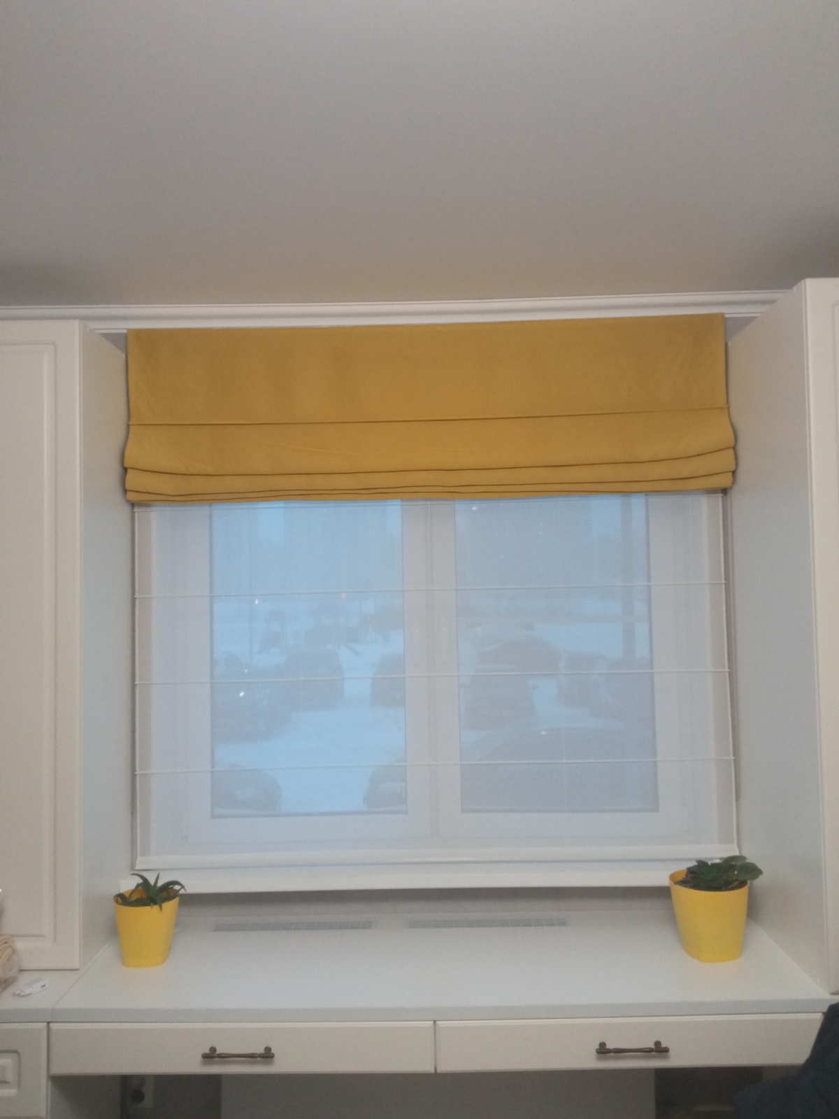 Состоят из двух тканей - основная ткань и тюль, со специальным карнизом с двумя механизмами управления: цепочкой или веревочкой